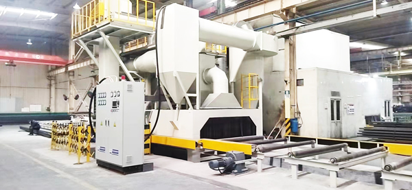 本设备为高效率连续作业钢材预处理生产线。钢材通过辊道经预热后送进抛丸清理室,